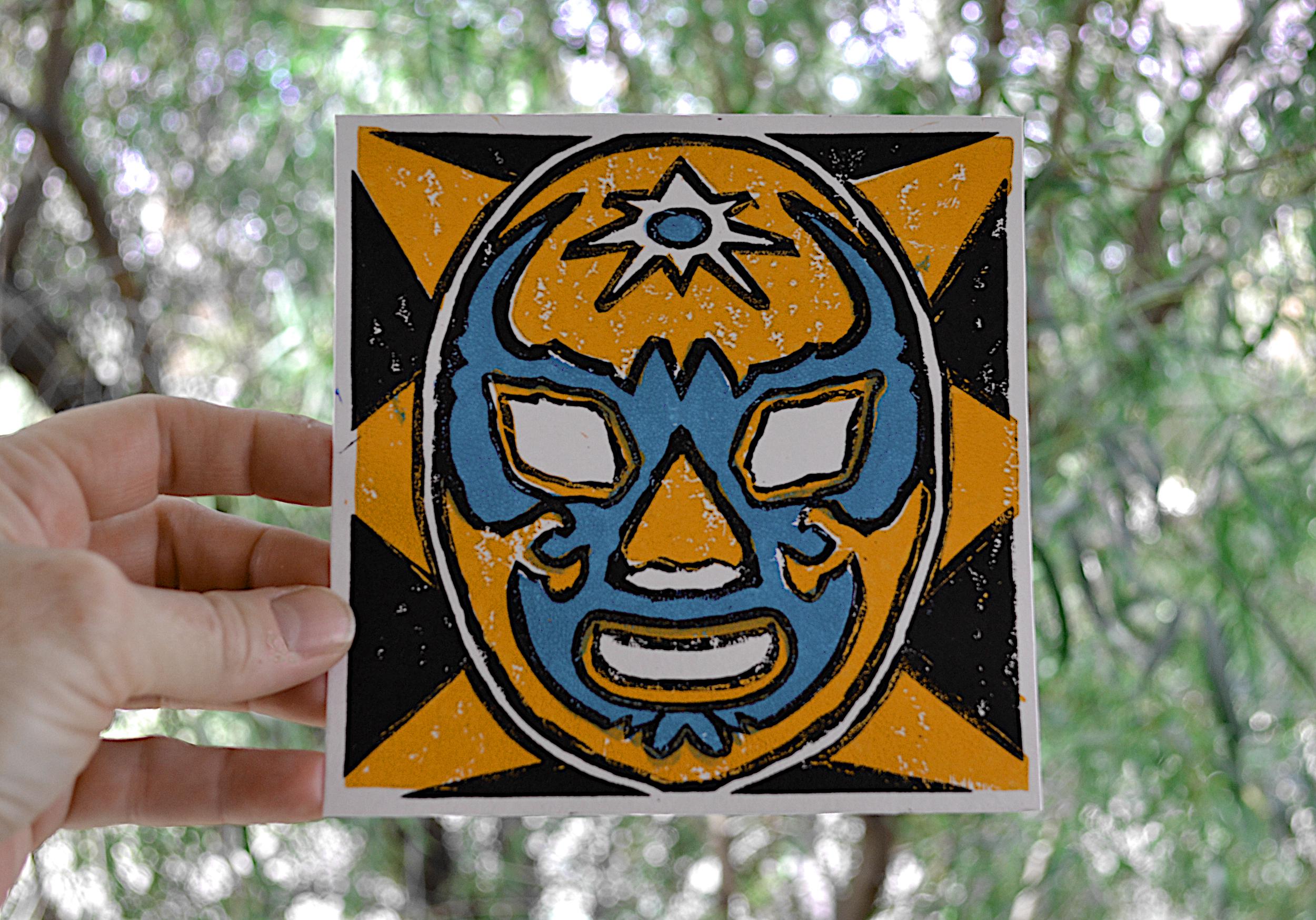 All of my linocut prints are completely original: hand-drawn, hand-cut and hand-pressed. The sport and art of Lucha Libre (Mexican wrestling) is so weird and wonderful - I love it, especially the part where the winning wrestler unmasks the loser, the ultimate humiliation.
